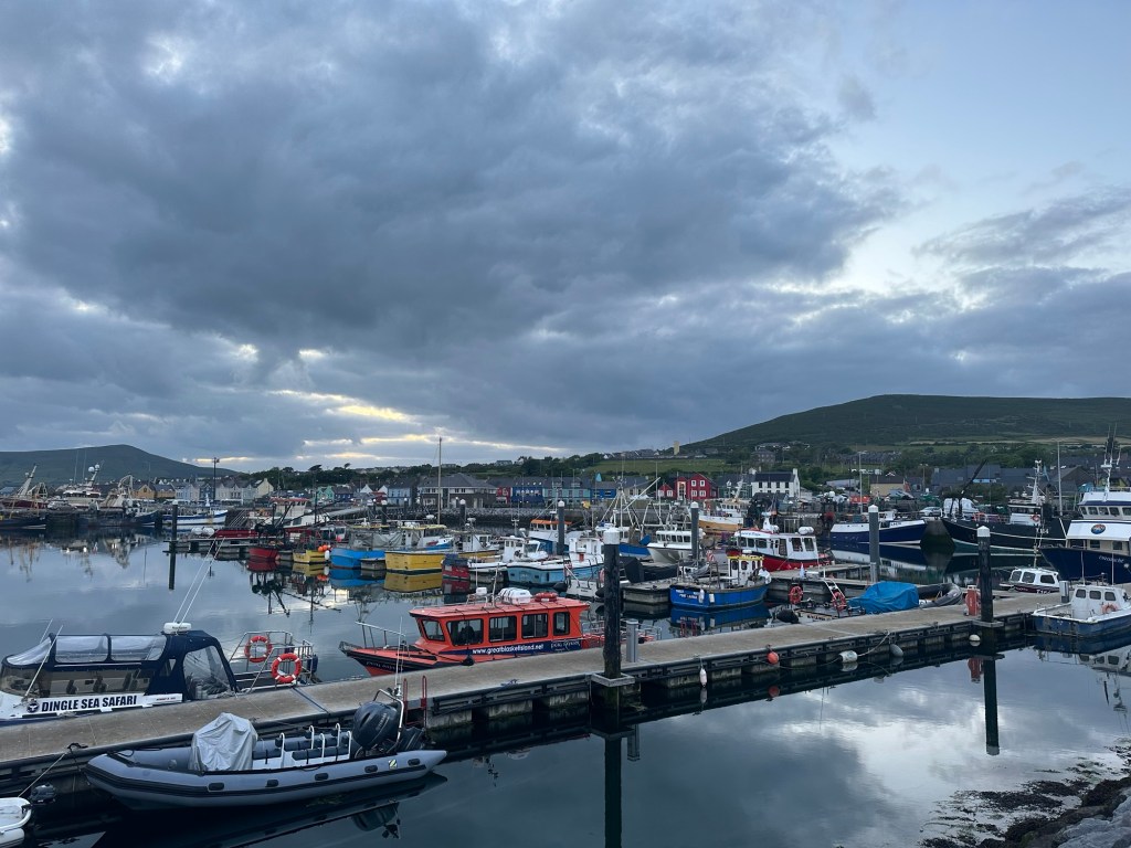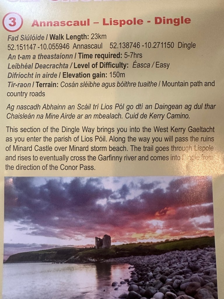 We made it to Dingle! Our required Camino miles in Ireland are complete! We have hiked 64 km ; approx 40 miles so far and both doing great. We now will have about 3/4 days to just hike all around the Peninsula before we head to Spain. We found a place called the Fishbox for dinner -incredible seafood chowder and Irish brown bread. Dingle is a beautiful little town with colorful shops, great pubs, music, stunning marina, and wonderful people!