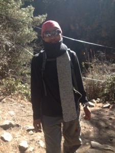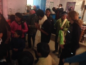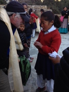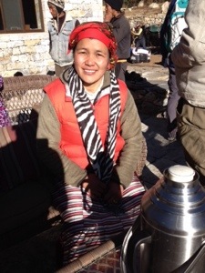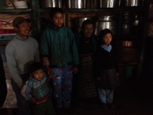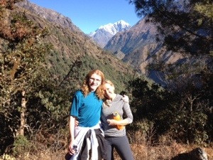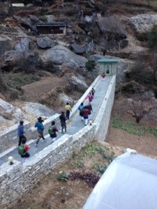 When the sun goes down over the mountains it is bitterly cold… No hot water, and no heat… In the tea houses and lodges, there is usually a wood stove or heater in the common room, where everyone huddles around to keep warm. Everyone gathers together for warmth, conversation, music, cards, and did I say warmth? In the morning we all walked about 2 hours to Ghat. The school was nestled at the top of the village, with a breathtaking view of the valley. Even though the winter holidays had started, all the ENG girls were lined up outside for our arrival. The rooms in this school were expertly setup, rivaling some of the best classrooms I’ve seen in the US (a French teacher has spent some time in this school a few years ago). Since multiple grades shared the room, the materials were color coded for the children. Dangling from the roof, attached by string, English vocabulary words and phrases added a festive and playful tone to the atmosphere. Pictures with English subtitles, songs and sentences adorned the walls, and Sangita and her classmate Sundya gleefully belted out “if your happy and you know it clap your hands” to our delight and we sang along! The school ceremony was short and sweet, a welcome by the principal and some teachers, a few dances by the girls and the presentation of backpacks filled with school supplies, down jacket, and uniforms. Sangita gave a short but moving speech about the impact education has for her and her gratitude for having this opportunity. A testament to the power of this program… We were all in tears as she discussed not wanting to disappoint us… Can you imagine? Bryce was asked to speak at the ceremony and Mike consulted with teachers… I held children and we all gave scholarships!group of Korean tourists spotted the ceremony and ascended to the school to watch; by the end of the program, with no solicitation, they had emptied their pockets of all the money they were carrying as a donation, apologizing they didn’t have more and pledging to donate more once they were home! As a side note… There were 2 twin baby girls nestled into a basket together that I just fell in love with ! The ceremony was followed by some home visits, where again I was humbled by the families who have so little but offer so much to their guests. In this case, our group of 4 was offered natural popcorn, and a local traditional meal of small boiled potatoes which you peel by hand and dip in onion chill sauce. The little girl from this home walks from her house, along the animal trail, across the suspension bridge , and up the mountain every morning early. Following the ceremony, we went finally made our way to our lodging, which was a house/lodge by Carol and Nema, cousin of Passang.