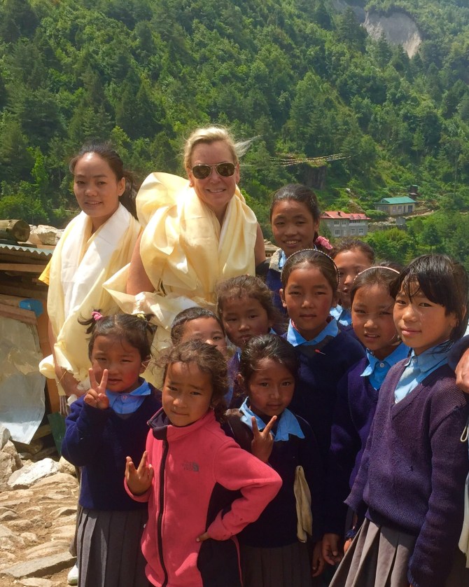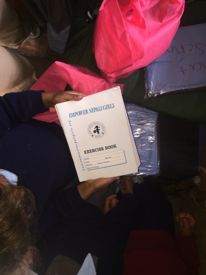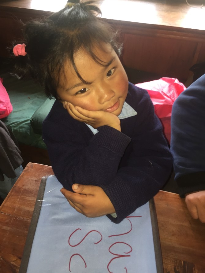We left Lukla and began to trek. After climbing for awhile we rounded a curve in the trail and there, above us stood out sweet girls from the Ghat School waiting to walk with us! I was so happy to see their faces I could have cried! They have grown so much! We had a wonderful visit with girls and parents as we distributed supplies, lights, hygiene kits, and tarps.