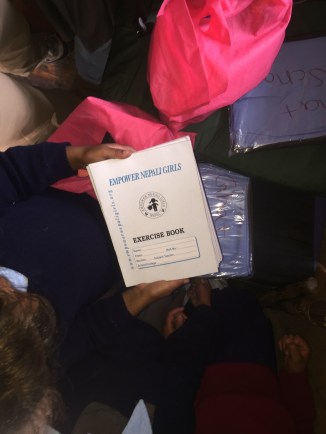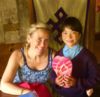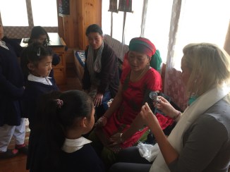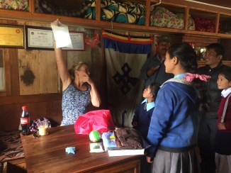 We left Lukla and began to trek. After climbing for awhile we rounded a curve in the trail and there, above us stood out sweet girls from the Ghat School waiting to walk with us! I was so happy to see their faces I could have cried! They have grown so much! We had a wonderful visit with girls and parents as we distributed supplies, lights, hygiene kits, and tarps.