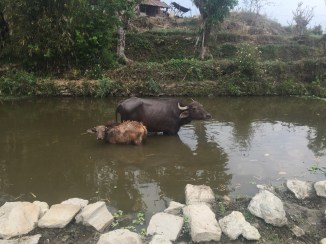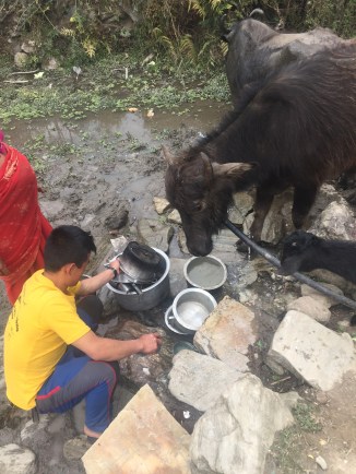 Spending time in a remote village is like living in a fish bowl. We were the first Caucasian people to visit there in years and the very first for many of the villagers to see. Therefore, we were a novelty and our every move was watched by many eyes, lots of talk about us and curiosity and zero privacy and I really mean zero. It was a bit disconcerting but at the same time very endearing. The entire village gathered for each interaction or school meeting or home visit. Our “camp” was located in the water buffalo field ( yes you read correctly) next to the spring that provides water to the village and a bathing spot for the water buffalo. We even unintentionally shared a cooking pan with them I guess you don’t say no to something that big!