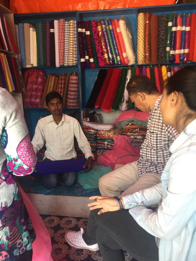Started the day with university visit and then on to order flooring for the schools, finalize furniture with the builder, and finally shopping for material for throw pillows for the kid’s resource rooms. Ended the day again around 8:00 crossing Kathmandu on a scooter ( me, Babi, two backpacks, and two very large bags of fabric) to try and make it back to meet with the group actually sewing the pillows. My daddy will be proud of my measuring and calculating for flooring, lumber, furniture, etc.