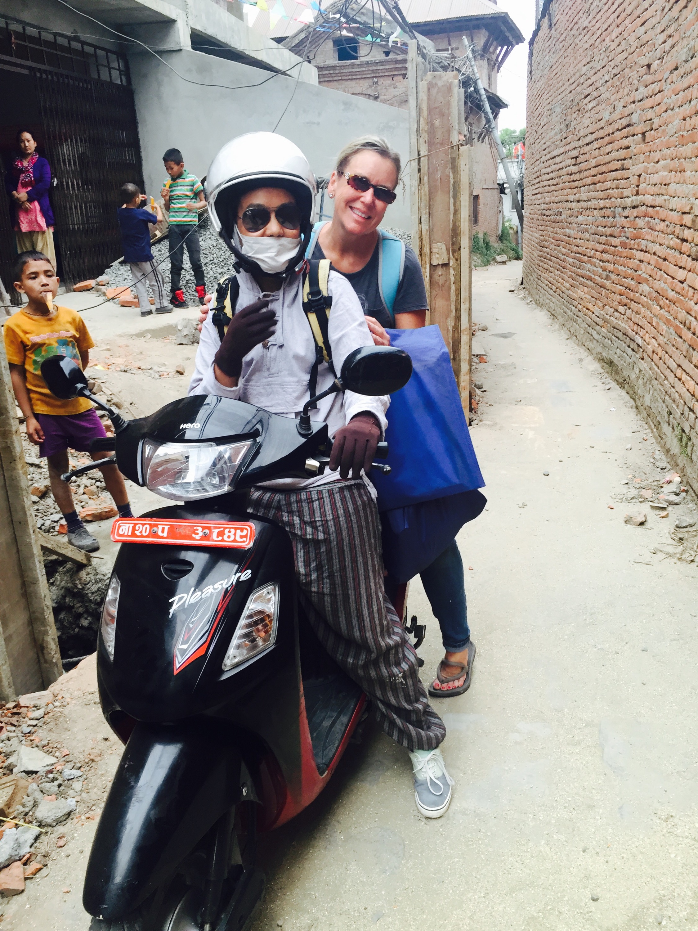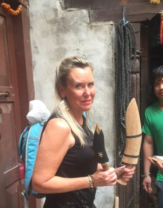 I walked to the Saturday farmers market today, new location, then caught a ride tad far as Thamel. This is notable because it was my first “sidesaddle” motorcycle ride in a dress. Memorable experience. I met the owner of a favorite spot , Fire & Ice and shared a cup of tea. My mission was to order Kukuri knives for ENG event and it was a successful mission. After looking and negotiating, and tea drinking in a back alley we are set!