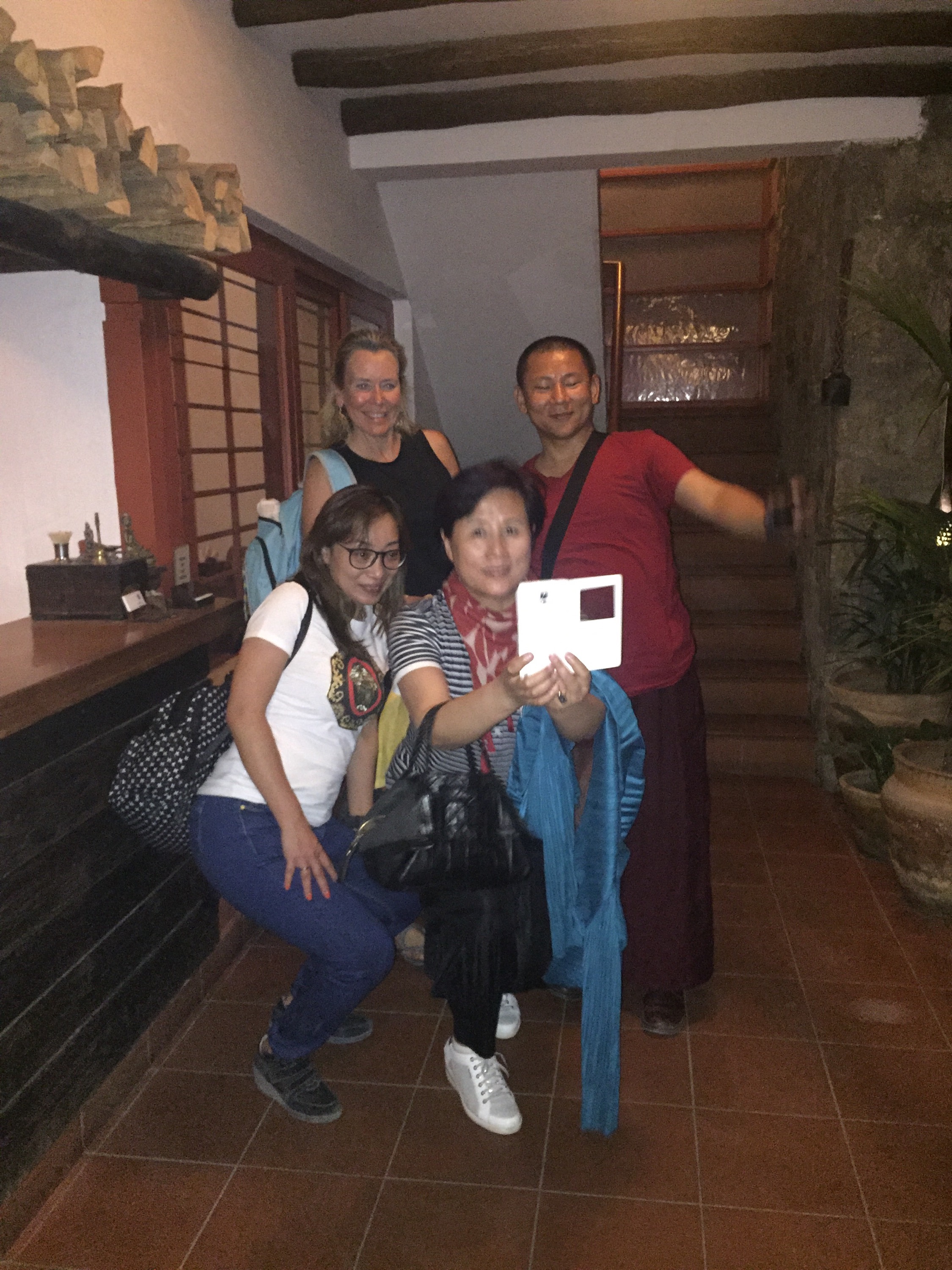 Sometimes the best moments happen when you are least expecting them if you just stay open. At the end of a lovely but long day, as it neared dark I stopped into Himilayan coffeehouse for a cup of coffee before heading home. I found a quiet corner and placed my order. As I waited a lovely Asian woman came and sat across from me and as I curled my legs under me to get comfortable she smiled and did the same-the beginnings of a friendship. Soon her friend came and joined us and began to chat and translate. They are from China, here in Nepal working with a school. We were also joined by their friend and guide who is a Buddist monk. We found many things to talk about and mutual connections, decided to go to dinner together and share a very unexpected lovely evening! Meet my new friends Guo ping, Lekshay, & Caroline. Thank you for such a fun and interesting night! p.s,. I shared my first and hopefully only car accident with these guys coming home tonight, very minor and no one hurt!