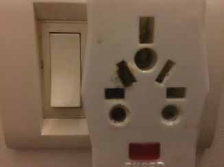 So this morning I had hot water which meant shower and hair washed. The electricity was on so I knelt on the floor to dry my hair because I have to hold the plug in the adaptor while I dry. I smelled smoke, glanced up and the outlet has blue flames! Good lord what a way to start. I’M AWAKE!!!! Gotta LOVE this place!