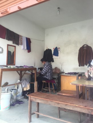 This tailor sets his machine on the sidewalk outside the cube he calls home, a fabric shop ( maybe 20 bolts of colorful fabric) with a mattress in the back corner to sleep on.