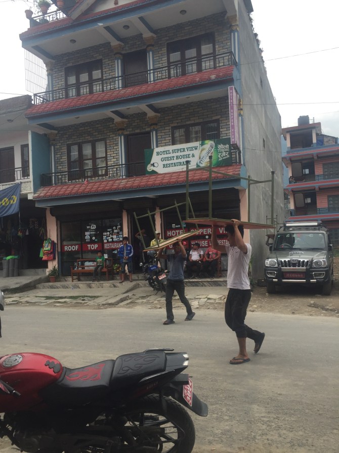 So, remember the carpenter and desk that left yesterday from kathmandu to arrive before us in Bahandada? Yep! We made it to Besisahar to transfer all the materials to jeeps to get them up the mountain, look across the road and SURPRISE! Our desk are just sitting across the road in a field…. 40 of them.