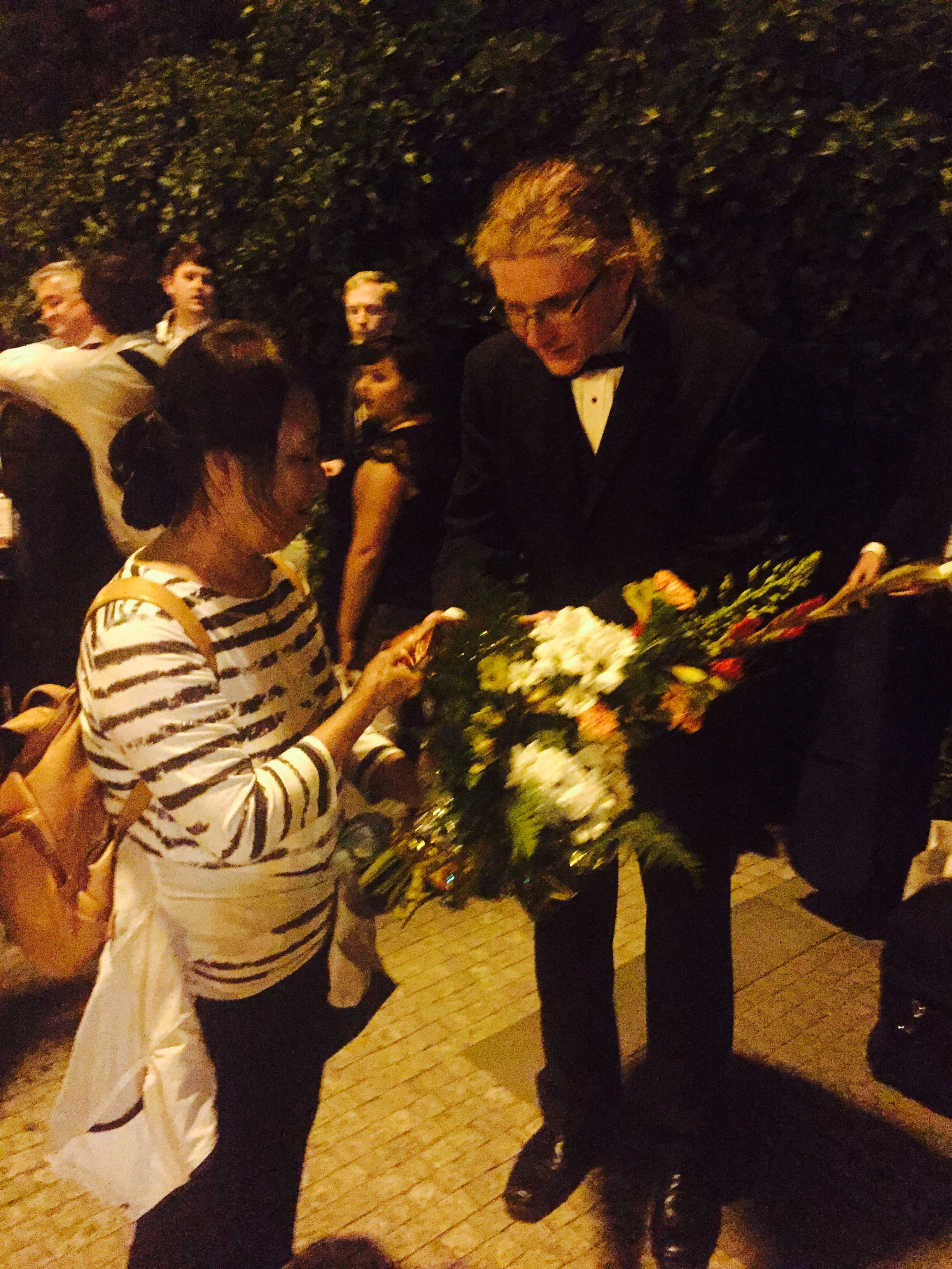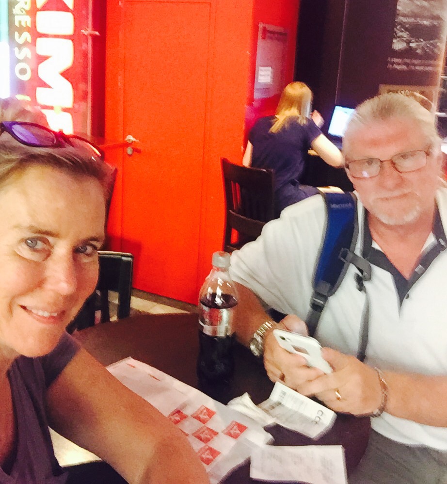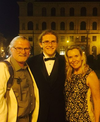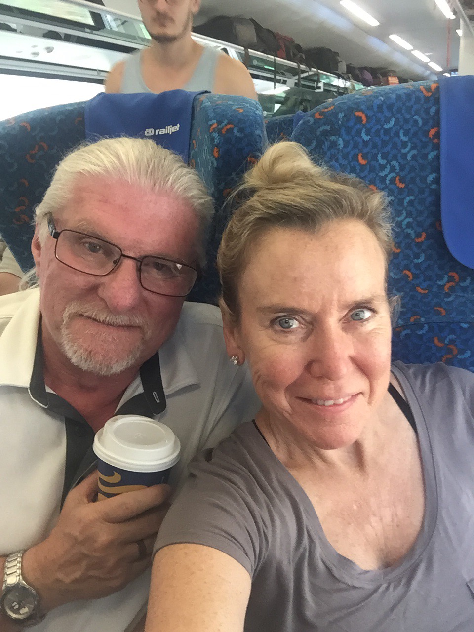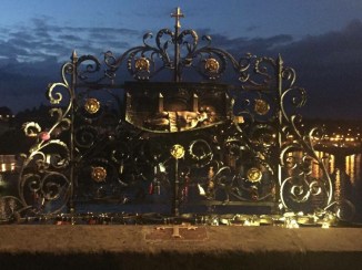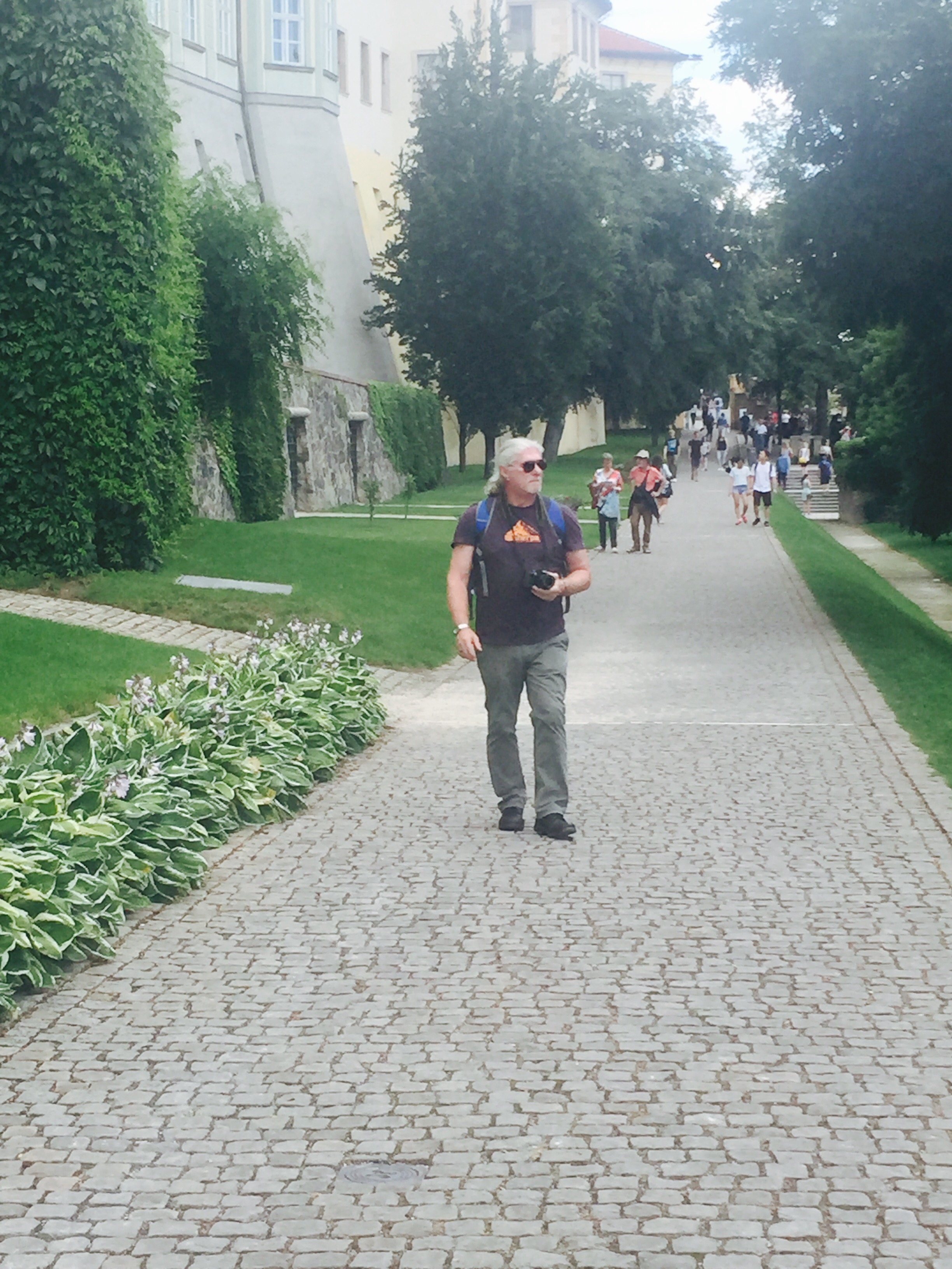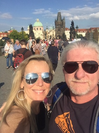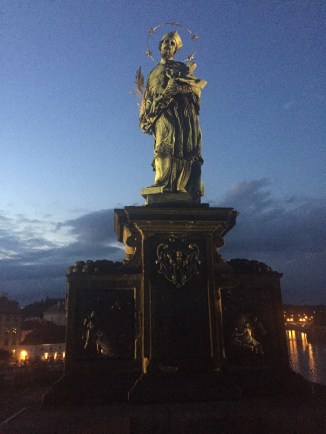 We ate at an outdoor cafe while it poured rain and we sat cozy watching people scurry for cover. Next, a walk along the Charles Bridge leading to the castle at sunset. This bridge was built by King Charles IV and was completed in the 15th century. The guard towers are immense and it is lined with baroque statues of patron saints. The most famous is St. John that was martyrd on the bridge in 1393. The bridge is a lesson in history, religion, and mysticism. It is believed that if you touch the plaque of the Saint in just right way, paying homage to the stars you will ensure your return to Prague. Touching the fallen priest fulfills a wish in a year and a day. We will see! Our walk home included a traditional chimney cone and ice cream!!!!