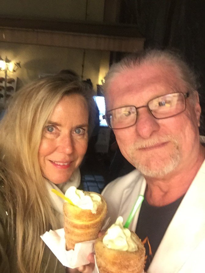 We ate at an outdoor cafe while it poured rain and we sat cozy watching people scurry for cover. Next, a walk along the Charles Bridge leading to the castle at sunset. This bridge was built by King Charles IV and was completed in the 15th century. The guard towers are immense and it is lined with baroque statues of patron saints. The most famous is St. John that was martyrd on the bridge in 1393. The bridge is a lesson in history, religion, and mysticism. It is believed that if you touch the plaque of the Saint in just right way, paying homage to the stars you will ensure your return to Prague. Touching the fallen priest fulfills a wish in a year and a day. We will see! Our walk home included a traditional chimney cone and ice cream!!!!