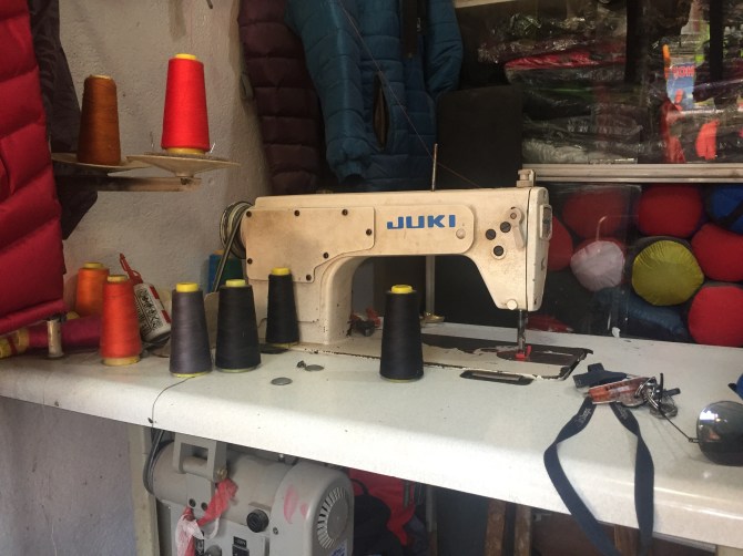 We went to the tailor shop that we use for ENG. Those of you that donate a scholarship provide two school uniforms and a coat in addition to tuition for a child. The uniforms for Little Moon School are in progress. These photos are of the shop, the skirts, and the machine they are sewn on.