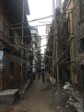 Many of the oldest buildings in Asan were destroyed completely in the earthquake. 2 years later the buildings are extremely unstable and they are propped with bamboo for support. People have no option but to go bsck in to live. Just walking through makes me think twice because the alleys are so narrow with nowhere to go. Breaks my heart.
