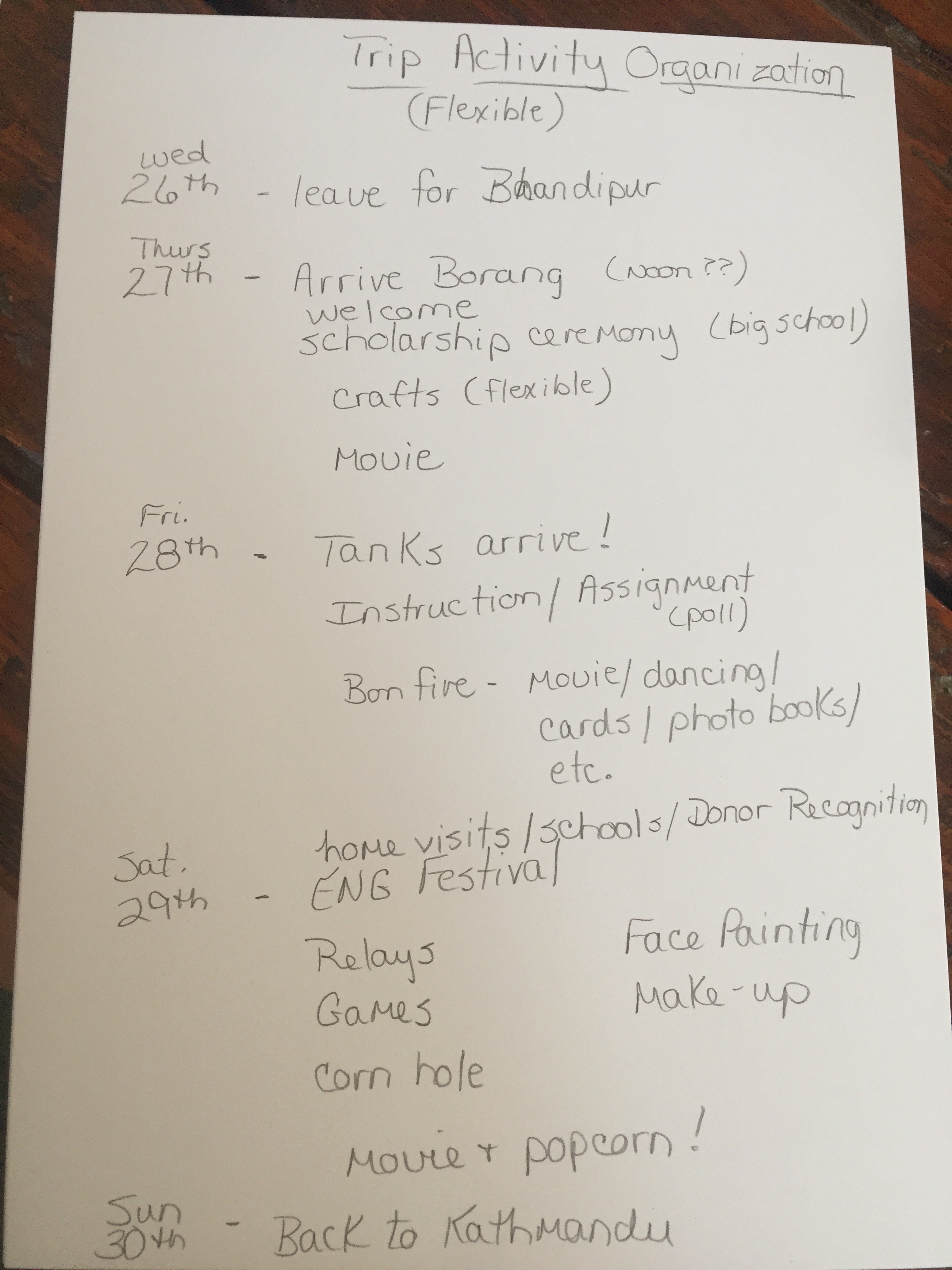 I posted information about our eng leadership and our older volunteers that will travel with us and serve as team members/interpreters on our trip to Borang next week. We also had a bit of photo fun at the end of our orientation day. They are so much fun to be with. Developing leadership for the future of girls in Nepal and having a bit of sillinesswhile we work.