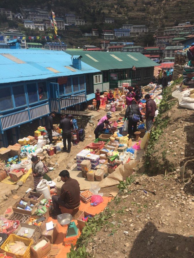 Namche Bazaar Posted on May 19, 2017 by Patrice Each week traders set up on the sides of the trail to sell and trade wares. Namche was once the primary trading route for those between Everest and Tibet. It is the last larger village before Everest. Share this: Click to share on X (Opens in new window) X Click to share on Facebook (Opens in new window) Facebook Like Loading...
