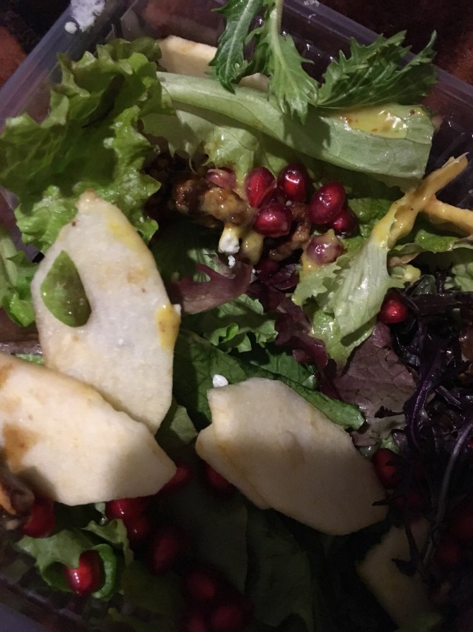 On the way home I had to stop for a bit of banking. It took me a while, but I stood in the middle of the bank observing until I understood the ebb and flow of human traffic, Take a number, fill out a banking slip with much used carbon copy paper, choose a line, and try to hold your place to get a chance at the window. Success! I am wonderfully exhausted mentally and physically but a walk to the market and I’m ending the day with a beautiful pomegranate, apple salad and a chai tea. What an amazing experience!