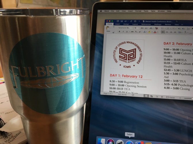 Working with the faculty to plan a three day mental health practitioner conference sponsored by ICMS & NSU. It was colder inside than out so I chased the spots of sunshine around as I designed a brochure to reflect our plans. The collaboration and excitement is contagious! I contacted the ambassador and she agreed to be our keynote speaker!