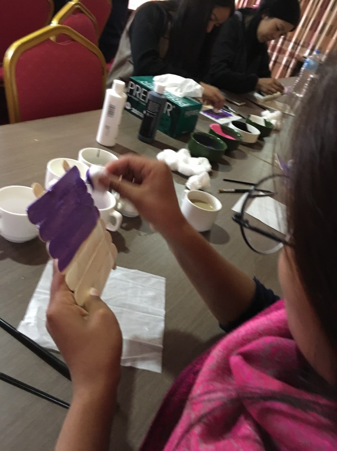 We tried a “painting with a twist” activity with the shadow of a woman. We made the canvases from Popsicle sticks and string. The girls all individualized the paintings and many incorporated ENG.