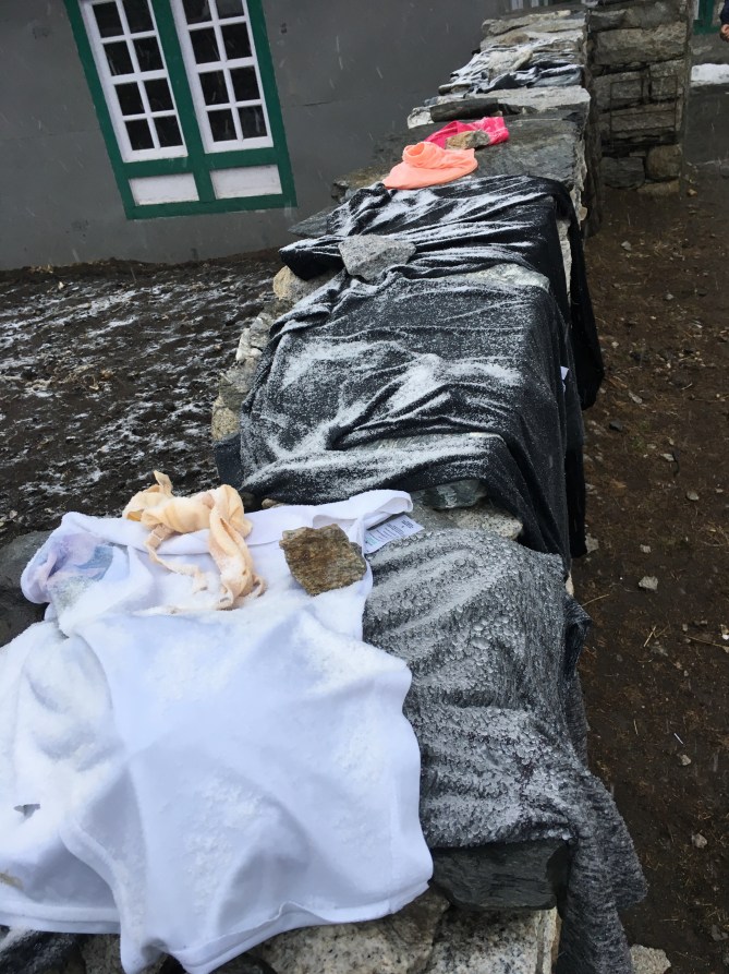 Big snow storm last night. No showers from this point on. Living on disposable underwear, washcloths with boiled water, and chapstick!