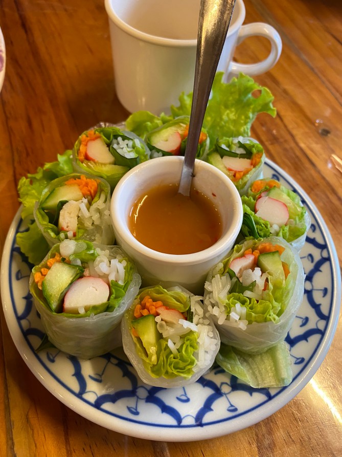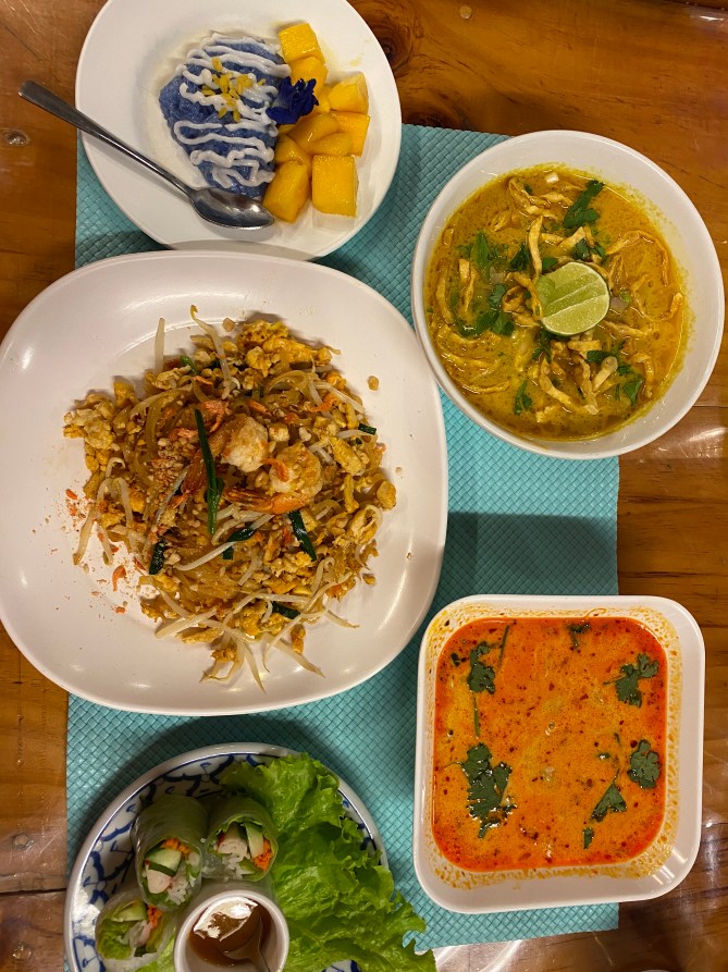 I made fresh spring rolls, yellow shrimp curry soup, Tom yum soup, pad Thai with shrimp and mango sticky rice dessert!