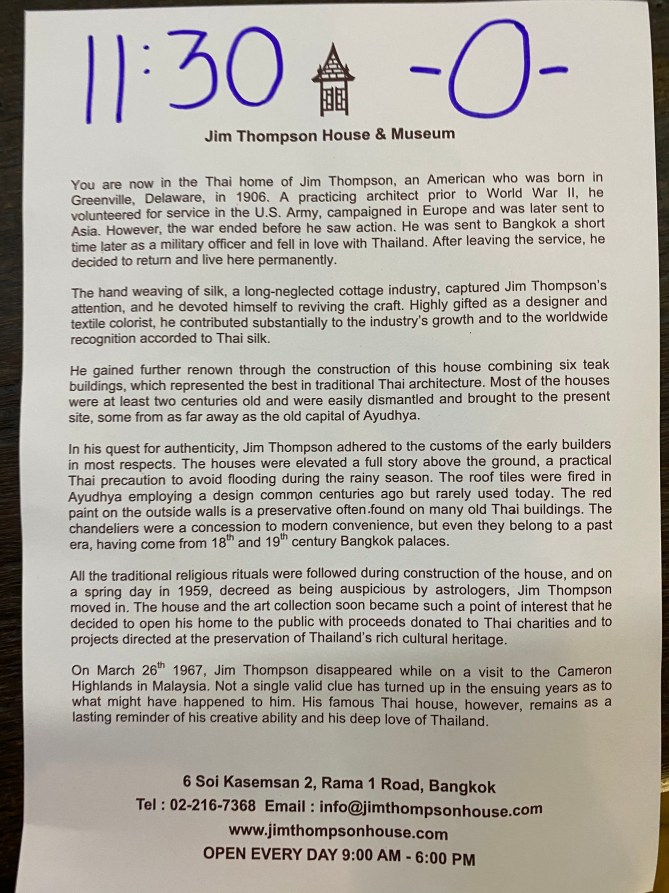Jim Thompson Museum Posted on January 22, 2020 by Patrice Share this: Click to share on X (Opens in new window) X Click to share on Facebook (Opens in new window) Facebook Like Loading...