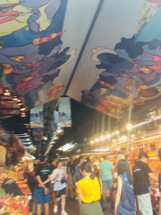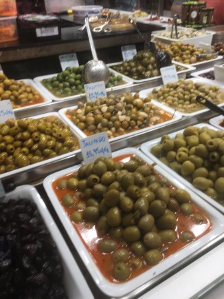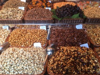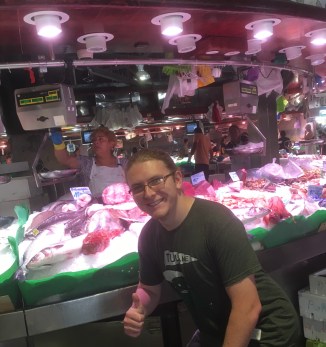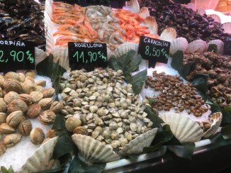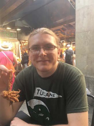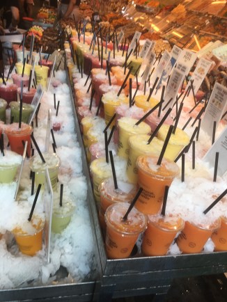 Mecardo de la Boqueria is one of the largest public markets in the world. After exploring, we decided on treats of prosciutto, chees, Iberian ham, croissants, fried octopus, and coffee! We just wandered and bought a bite here and a bite there until we decided to sit and order coffee with it.