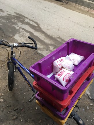 Fresh milk delivered in small plastic bags stored in stacked plastic bins on a bike outside my door this morning